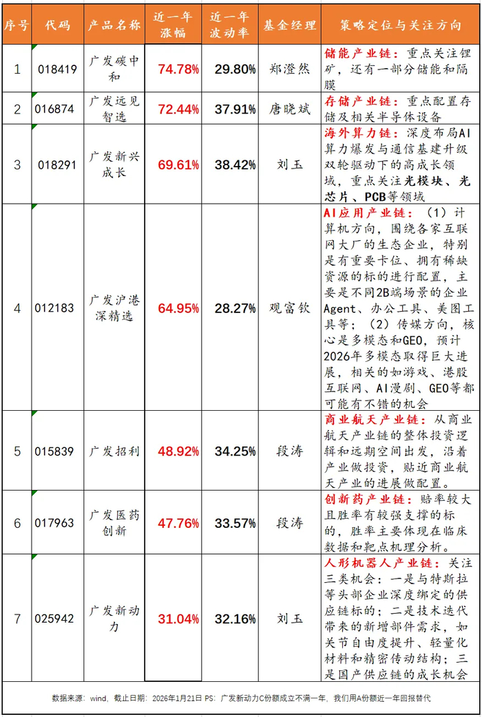 正好,近期基金四季报陆续发布,我们对照开年以来的涨幅榜翻阅季报进行研究,对广发旗下的主动基金进行了筛选,发现下面的十几只产品是深耕产业的主动股基。