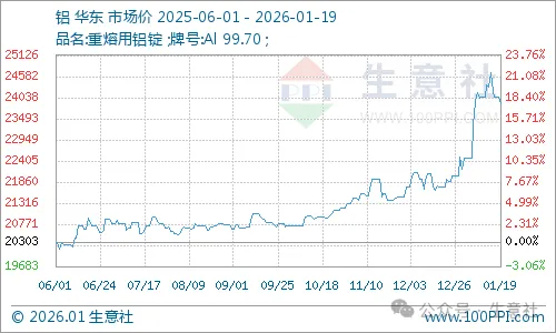 1月铝价表现依旧强劲,近期有小幅回落。据生意社商品行情分析系统,截止2026年1月19日国内铝锭华东市场均价23890元/吨,较1月1日市场均价22473.33元/吨,上涨6.3%;较月内高点(1.14)市场均价24673.33元/吨,下跌3.17%。