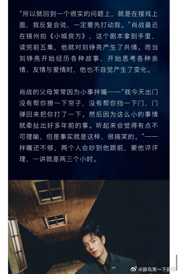 肖战于 ELLE 采访分享接戏准则,称剧本必须先打动自己,因共情刘铮亮接拍《小城良方》,同时透露想观察陌生人生活的想法。