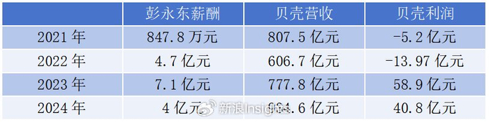 彭永东的天价薪酬之所以引发争议,在于其薪酬暴涨与贝壳的业绩表现并不匹配,甚至出现倒挂。比如2022年,贝壳营收同比下滑24.9%,净亏损13.97亿元,当时彭永东的薪酬却翻了近56倍。