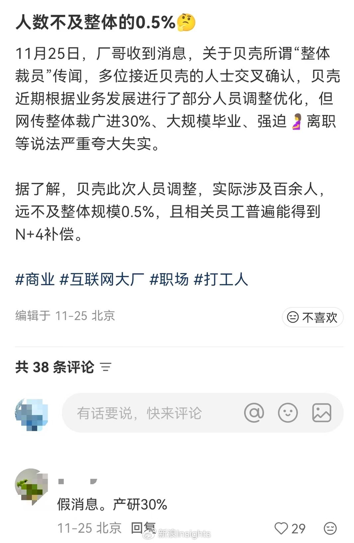 关于贝壳的裁员比例的问题,有网友称,“贝壳裁员人数不及整体的0.5%”是假消息,产研30%。