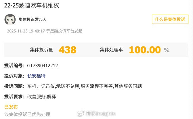 11月底,黑猫消费者投诉平台上,又出现几百名长安福特蒙迪欧车主发起了集体投诉进行维权。车主表示2022年-2025年款欧蒙迪的车机出现系统卡顿、行车过程中因无物理按键,在操作空调和其他设置时无法正常操作等问题,对道路安全和人员产生重大威胁。