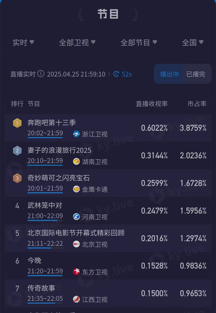 4月25日晚间,《奔跑吧》第13季的首期节目,在浙江卫视播出。根据酷云实时的收视率数据来看,这档综艺刚一开播,便实现了收视率上的飞升。从0.2%前后,一路直线上扬到了0.6%以上。《奔跑吧》第13集的播出时间段,浙江卫视的收视率也成为全部卫视平台当中的第一。并且,这个第一,是“大比分”领衔第二名的。显然,这一季的《奔跑吧》,依旧有着旺盛的生命力。