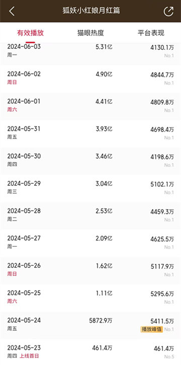 同样的数据平台,我们再来看看杨幂主演的《狐妖小红娘》的播出数字。其上线首日,461.4万的播放,不如刘诗诗《淮水竹亭》的开局。但是,该剧在第二日,实现了5411.5万的单日播放成绩。这个播放成绩,直接吊打了《淮水竹亭》的第二日。《狐妖小红娘》第三日的播放成绩是5295.6万。第三日,《狐妖小红娘》再次吊打《淮水竹亭》。同时,在第三日,《狐妖小红娘》播放破亿,领先《淮水竹亭》。第四日,《狐妖小红娘》播放5117.9万,依旧比《淮水竹亭》强很多。