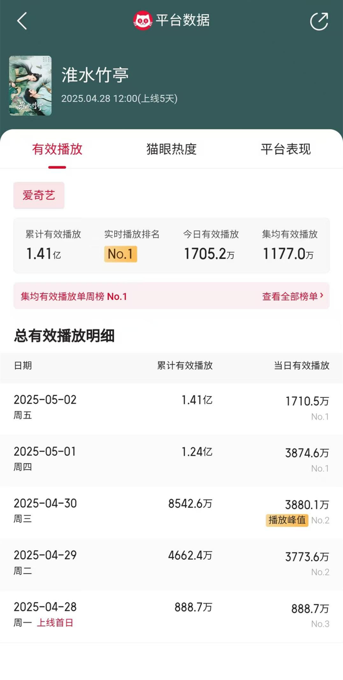 猫眼专业版方面的数据,刘诗诗主演的《淮水竹亭》上线首日,播出888.7万,第二日播出3773.6万,第三日播出3880.1万,第四日出现了数据上的下跌,下跌到了3874.6万。这部《淮水竹亭》,也是在第四日正式播放过亿。