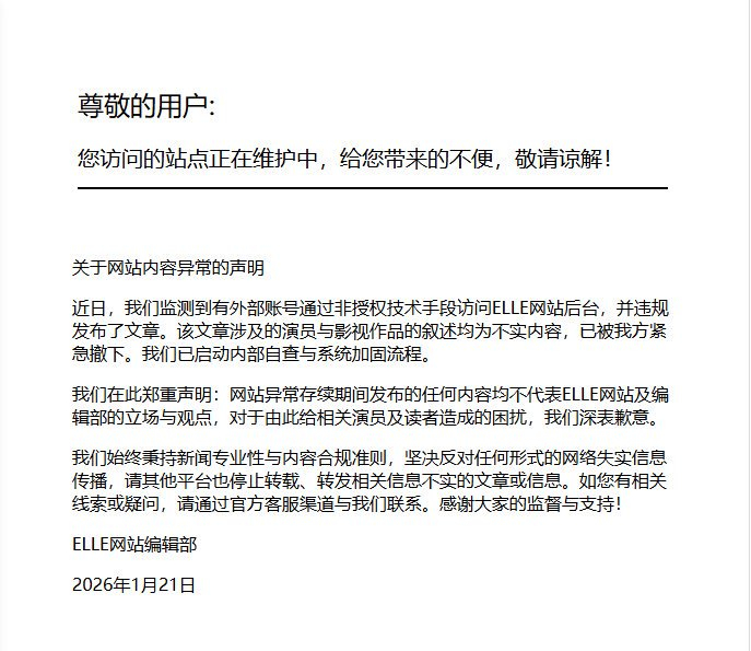 稍后,1月21日,ELLE的自家网站上发布了一份公告内容,告知观众,网站被黑客入侵,并且发布了一篇针对电视剧和电视剧主演的文章,这篇文章并不代表自家平台立场,希望大家不要传播这篇文章。