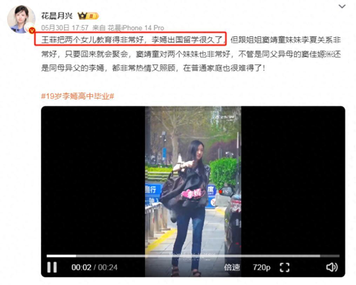面对大家对李嫣的高度关注和舆论的热议,有微博媒体大咖晒出了一段拍到的李嫣短视频,同时配文:“王菲把女儿照顾得非常好,李嫣也出国学习很久了”。