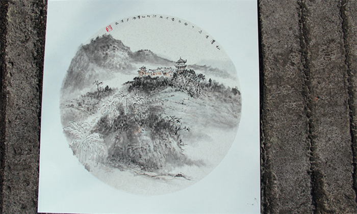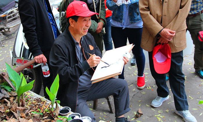 据了解,在本次写生采风活动中,泸州市美术家协会的各位美术家们刚走进仙潭酒厂,就迫不及待地先后参观了酒厂厂区酿酒车间、窖池、灌装车间、贮藏酒库等地。当大家行至贮藏酒库时,泸州市美术家协会邓光源主席在布达拉宫前驻足良久。布达拉是一栋红白相辉映的储酒库,因其形似西藏布达拉宫而得名,红窗白墙,色彩明艳,楼前一颗生出新芽的老树,春风拂过,一地的落黄,此情此景让人油然生发出一股诗意,邓主席也已被这美景动容,开始动笔画了第一幅图!不一会儿,两幅水墨扇面图就已成型。见到邓主席泼墨挥毫、即兴而作的场景,我也不由生发出一股感叹:仙潭酒厂布达拉,红白黄绿宫英华。邓老一支回春笔,水墨美景笑春花。