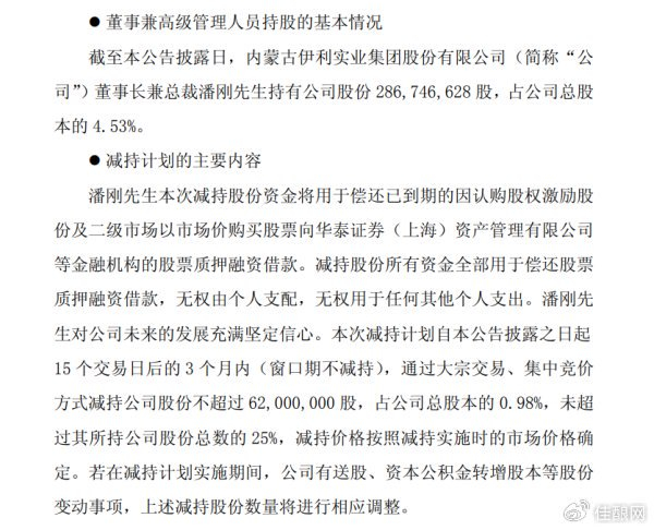 该消息一经公布,引起市场广泛讨论。尽管伊利股份在公告中明确表示,计划减持的目的是为了“偿还股票质押融资借款”,同时也强调潘刚对公司未来“充满坚定信心”,但市场仍对伊利董事长将减持股份的事极为关注。