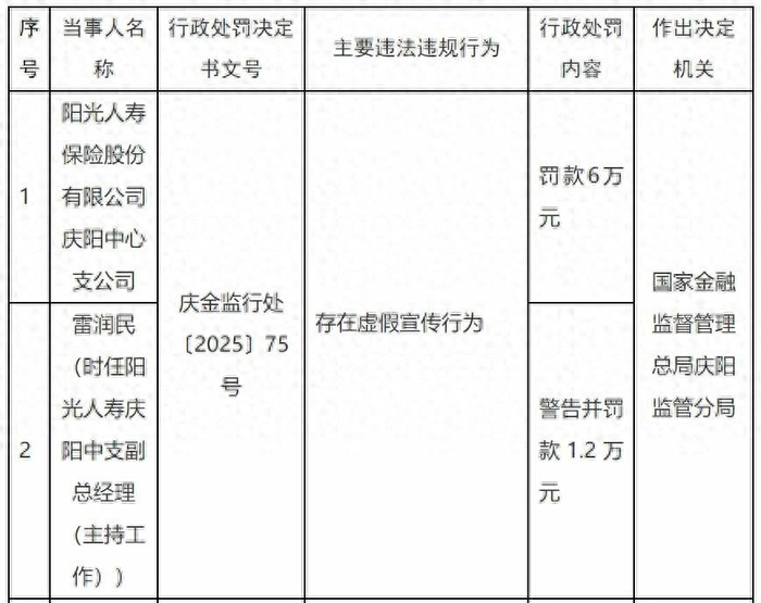 10月29日,国家金融监督管理总局庆阳监管分局发布的行政处罚信息显示,因存在虚假宣传行为,阳光人寿保险股份有限公司庆阳中心支公司被罚款6万元,雷润民(时任阳光人寿庆阳中支副总经理(主持工作))被警告并罚款1.2万元。