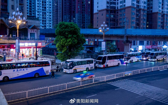 晨曦微露,“不夜城”贵阳市南明区花果园从宁静中苏醒过来。延安南路一侧,几十辆旅游大巴排起长队候客,举着各色旗子的导游大声招呼游客,拉着行李箱赶路的人们一路谈笑风生。