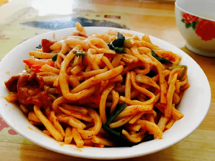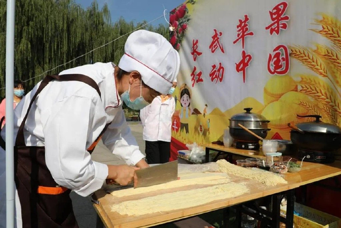 长武刀剺面俗称长面、涎水面,历史悠久、内涵丰富、积淀深厚,是中国最古老的一种面食。自先周始祖公刘在长武县开启汉族与少数民族融合之时,刀剺面便在农耕文化中衍生而来。长武刀剺面中当属南塬刀剺面颇具特色,是当地人喜爱的传统风味小吃,也是主家待客的“硬菜”。长武南塬刀剺面讲究色香味俱全,具备“薄、筋、细、长、光、煎、稀、汪”的特点,达到“擀成纸,切成线,下到锅里莲花转,捞到碗里挑不断,臊子浇上你再看,一顿能吃八碗半”。