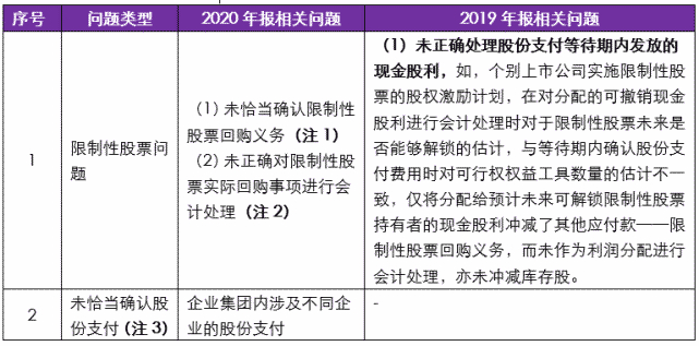 2018年会计监管报告中,未涉及股份支付相关问题。2019年报、2020年报会计监管报告中相关问题对比提示如下: