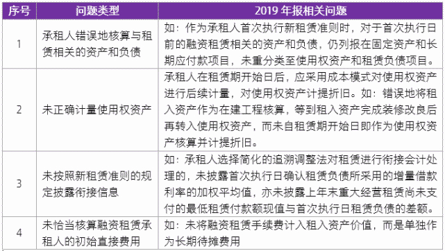 2019年A+H上市公司开始执行新租赁准则,其他执行企业会计准则的企业自2021年1月1日起施行,在2018和2020年会计监管报告中尚未涉及新租赁准则相关问题。企业执行新租赁准则的关注重点,主要包括租赁的识别、租赁期的确定、增量借款利率的确定、租赁与非租赁部分的分拆、使用权资产的确认和计量、低价值资产租赁的判断、新旧租赁准则的衔接和承租人与出租人的披露等方面。