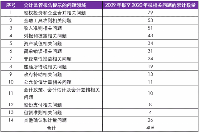 回顾证监会发布的上市公司2009年报至2020年报会计监管报告内容,部分上市公司对准则理解和执行不到位的问题涉及领域比较集中,其中,股权投资和企业合并相关问题涉及最多,其次是金融工具和收入准则相关等问题,2009年报至2020年报相关问题涉及数量汇总如下(按照集中度排序):