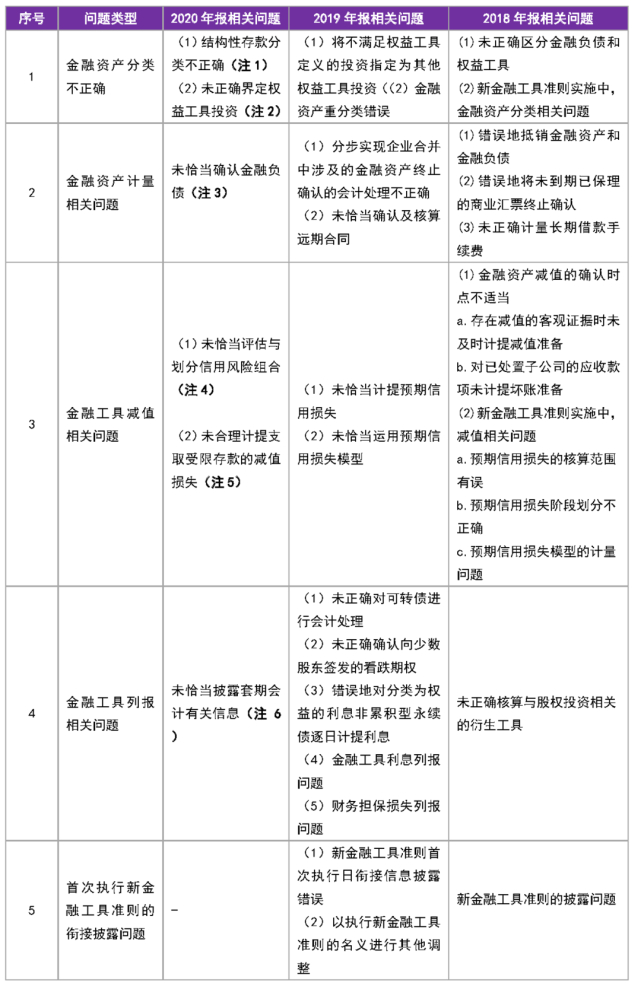 2020年会计监管报告中,部分公司在执行新金融工具准则中存在对金融工具的分类不合理,计量、减值和列报不正确等问题。2018年报至2020年报会计监管报告中相关问题对比提示如下:
