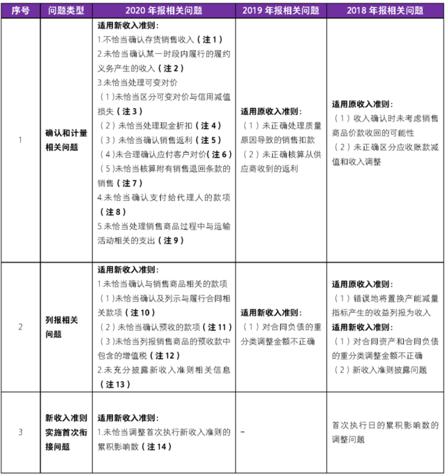 2020年会计监管报告中,新收入准则实施相关问题体现较为集中。2018年报至2020年报会计监管报告中相关问题对比提示如下: