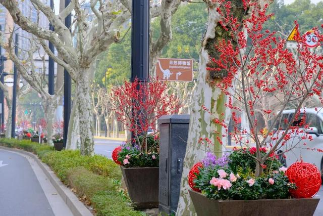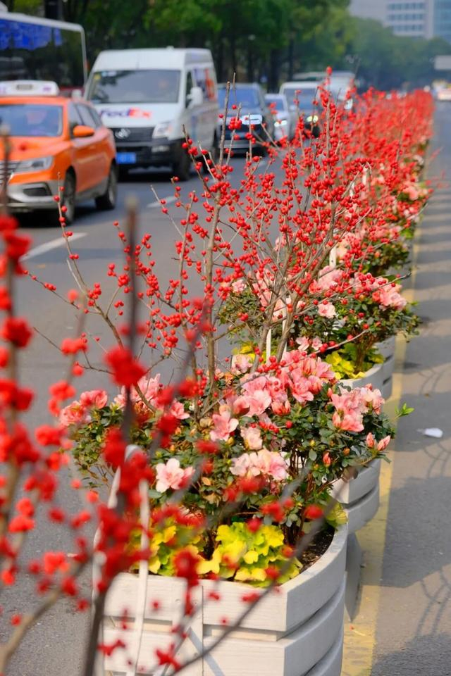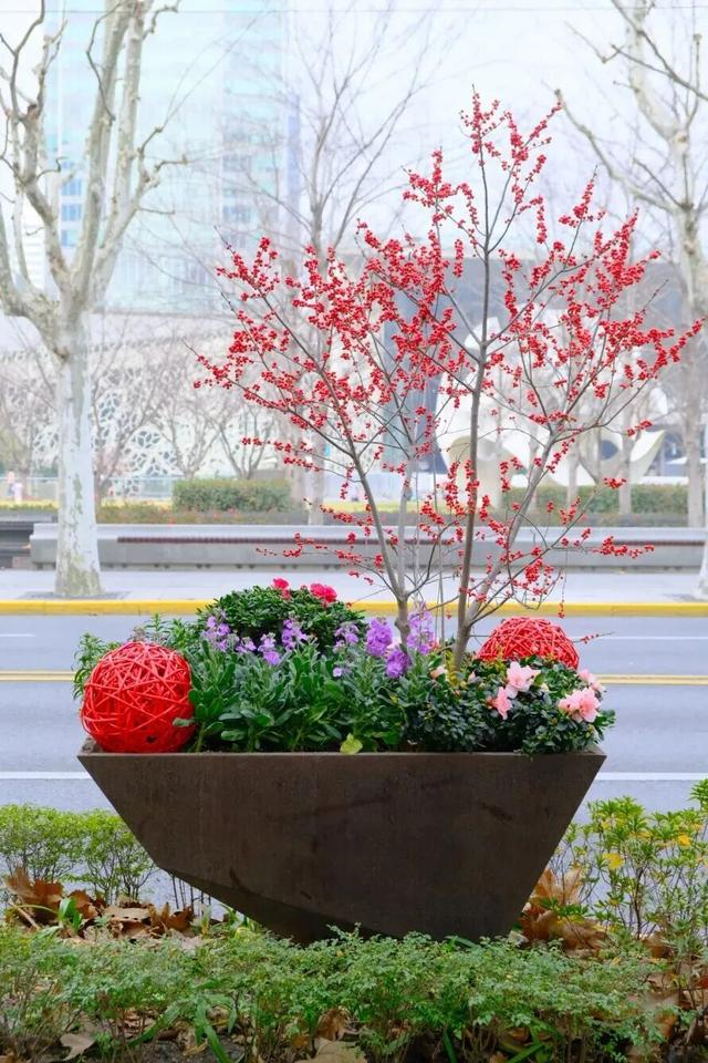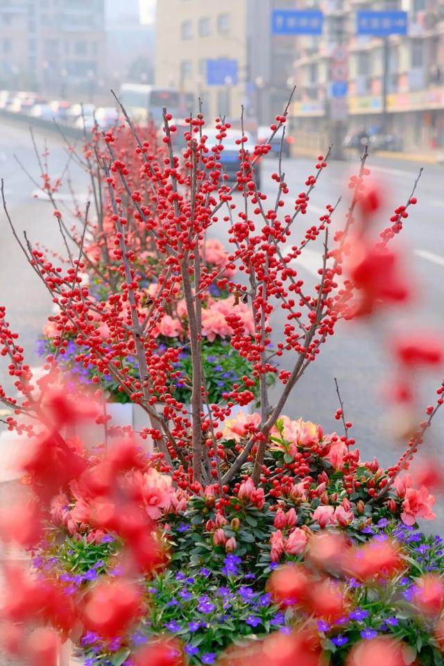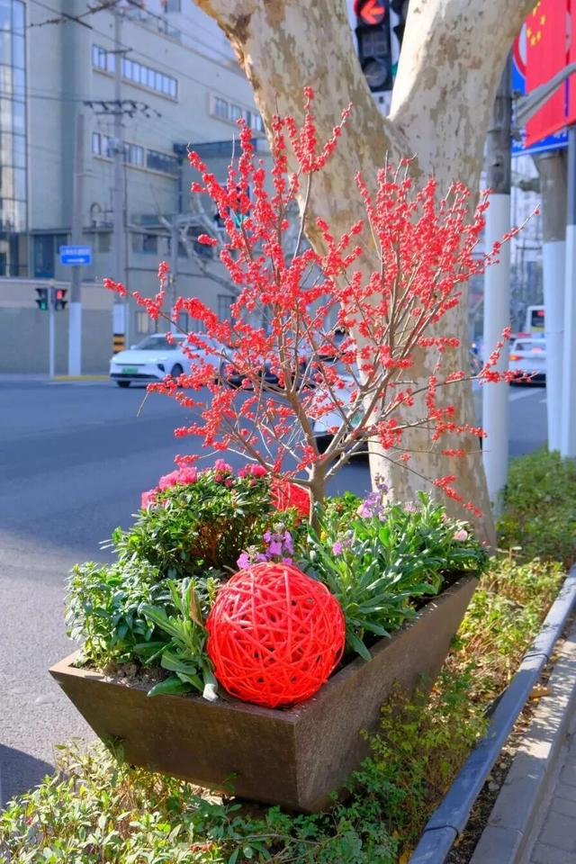 值得一提的是,在北京西路沿线,为映衬北美冬青的红果,管理部门首次加入了固定装置红色藤球,既支撑起大型容器的骨架,又与苍劲的冬青枝条相映成趣,进一步烘托出温暖浓郁的节日氛围。