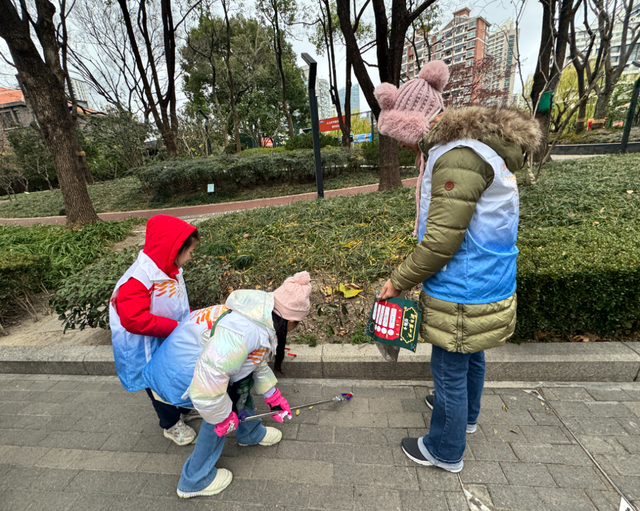活动现场还涌现出不少“小小志愿者”家庭,孩子们以纯真行动传递温暖心意。他们蹲在街角,用夹子仔细捡拾绿化带中的烟头,每找到一个就像发现宝藏一样开心;他们用抹布认真擦拭公交站台的长椅,不放过任何一个角落;他们小心翼翼地清理盲道上的障碍物,明白了这条特殊道路的意义;他们鼓起勇气,将暖宝宝送到环卫工人、快递员手中,用稚嫩的声音说“叔叔阿姨辛苦了,新年快乐”。