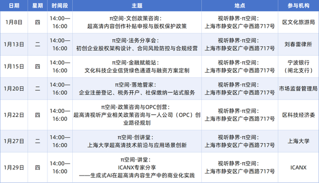超高清视听产业相关政策咨询、普惠金融互通会、人才政策咨询、文创政策咨询、法务咨询、信贷服务咨询、产教融合沙龙、企业注册咨询、科技创新政策宣讲、OPC创业路径规划、超高清技术讲堂、生成式AI讲堂、特色债券与知识产权融资等。