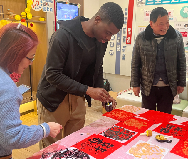 工作人员指着鱼的图案解释“年年有余”象征每年都有富余、生活安康时,他眼睛一亮,模仿着发音:“年、年、有……‘鱼’?”随即大笑起来,“我懂了!太棒了,这会是很棒的一年!”