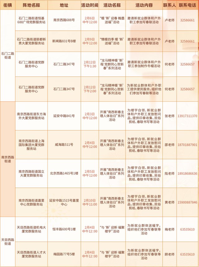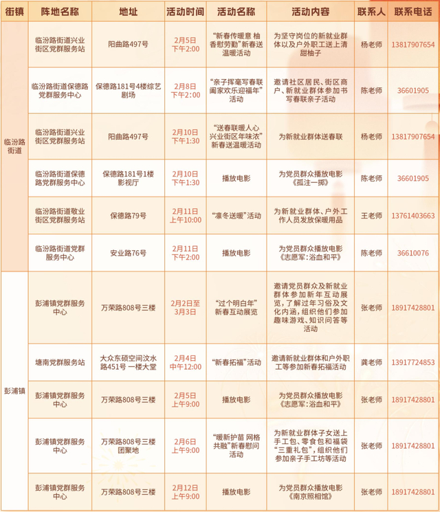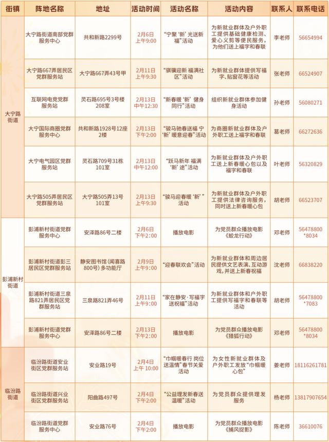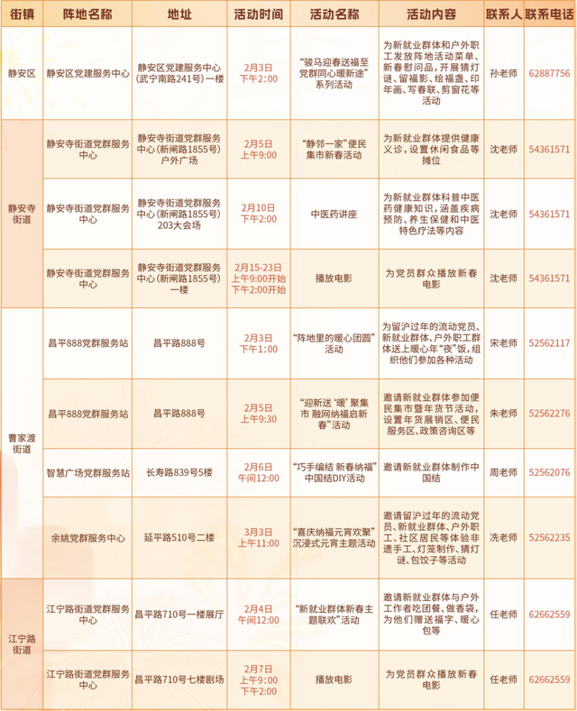 春节期间,静安区各级党群服务阵地将化身“暖心年市”,持续提供涵盖文化体验、健康关怀、暖心服务等多维度的迎新春活动,邀请所有留沪奋斗的一线劳动者前来自主“点单”、欢乐过节,确保服务“不打烊”、关爱“不断档”。