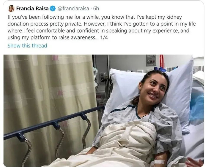 直到去年的世界肾脏日,弗朗西娅在她的社交媒体上分享了捐赠肾脏的过程。