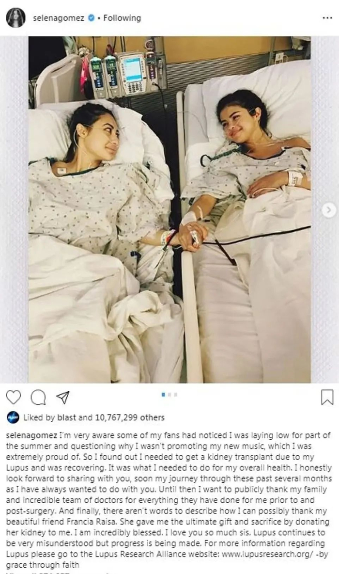 5年前,赛琳娜因为严重的红斑狼疮引发肾脏疾病,急需换肾。当时,和赛琳娜住在一起的多年好友——同是演员的弗朗西娅主动去做了配型检测,在得知肾型匹配后,决定为赛琳娜捐出一颗健康的肾。