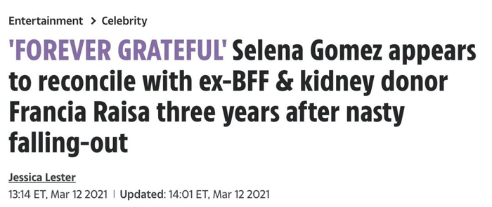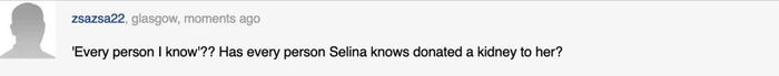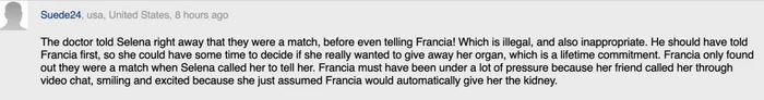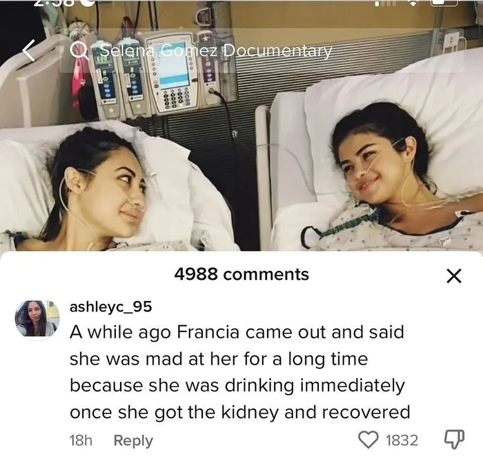 “(捐肾)不仅仅影响健康,如果她将来想怀孕,很有可能会被建议不要怀孕或被告知使用代孕,因为怀孕会损害她的最后一个肾脏。更不用说她在 100% 健康的情况下通过捐献肾脏而正在经历的已知的健康问题。看到赛琳娜这样对待她,这是一个巨大的牺牲,真的很难过。”