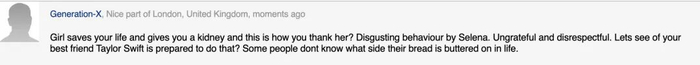 有不少人声讨赛琳娜:“那女孩救了你的命,给了你一个肾,这就是你感谢她的方式?赛琳娜的行为令人作呕,忘恩负义、不尊重。你的朋友泰勒会为你这么做吗?有些人就是不知道谁让他们受益…”