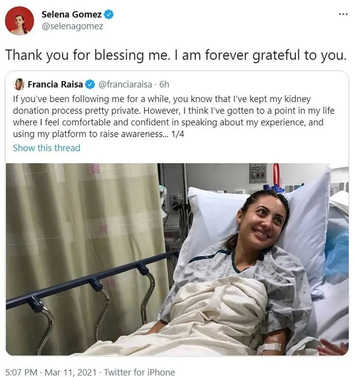 弗朗西娅也深情回复:“当我发现我和赛琳娜的肾型匹配的时候,我没有考虑(就做了),我很荣幸,因为我知道如果我处于同样的境地,她也会毫不犹豫地替我这么做的。”