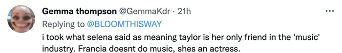 “我认为赛琳娜话里的意思是泰勒斯威夫特是她在“音乐”行业中唯一的朋友。弗朗西娅不做音乐,她是一名演员。”