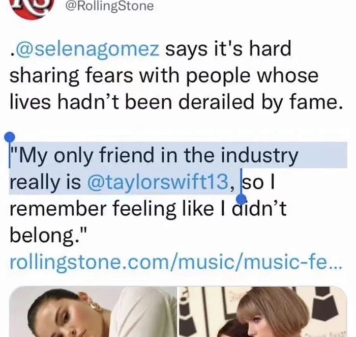 在聊到友情部分时,赛琳娜对认识了十多年的圈内好友霉霉公开示爱:“我从来没有真正融入过酷酷的女明星群体,我在圈子里唯一的朋友就是泰勒·斯威夫特,所以我记得那种格格不入的感觉…”