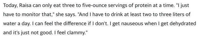详细描述了捐肾后自己的饮食习惯被迫改变,比如摄入的蛋白质量要保持在85-141克之内,每天必须饮水2-3升否则就会身体不适等等…