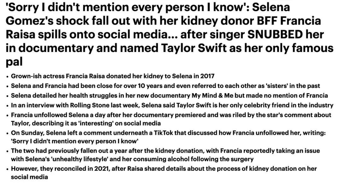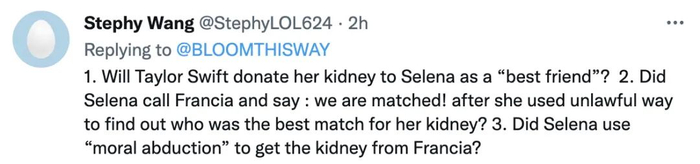 “1.泰勒斯威夫特会作为“最好的朋友”将她的肾脏捐给赛琳娜吗?2.赛琳娜给弗朗西娅打电话说:我们匹配了!在她用非法方式找出谁最适合她的肾脏之后?3.赛琳娜是不是用“道德绑架”从弗朗西娅那里得到肾?”