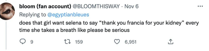 “那女孩是不是希望赛琳娜每呼吸一次都要严肃认真地说一句‘谢谢你弗朗西娅,谢谢你的肾’…”