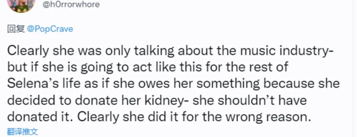 “很显然赛琳娜只是在说音乐圈,如果在赛琳娜的后半辈子里她都要这样,就好像因为她决定捐肾导致欠了她什么似的,那她当时就不该捐!很显然她搞错状况了…”