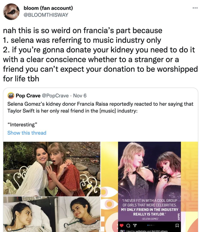 “弗朗西娅太奇怪了!1.赛琳娜只是在说音乐圈2.如果你要捐肾,不管是对陌生人还是朋友,你都要有清晰的是非观,不能指望你的捐献会被崇敬一辈子。”