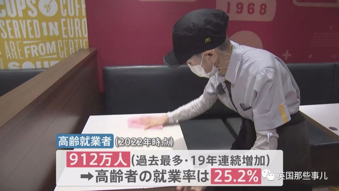 日本65岁以上还在工作的老年人达到912万人,连续19年增长,老年人就业率为25.2%。