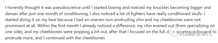 “……说老实话,我一开始以为这是伪科学,直到我开始练习拳击,并注意到才训练了一个月后,我的指关节就变得更大、更坚实了。我还注意到很多拳击手的头骨都非常结实。我开始在脸上进行敲打,因为我下巴的形状不规则也不突出,颧骨也一点都不突出。第一个月时,我已经注意到了一些变化,我的下巴变得平滑了(之前一侧突出),颧骨也有些突出了。之后,我开始专注于整个下巴,让它能更加向前突出,同时继续锻炼颧骨……”