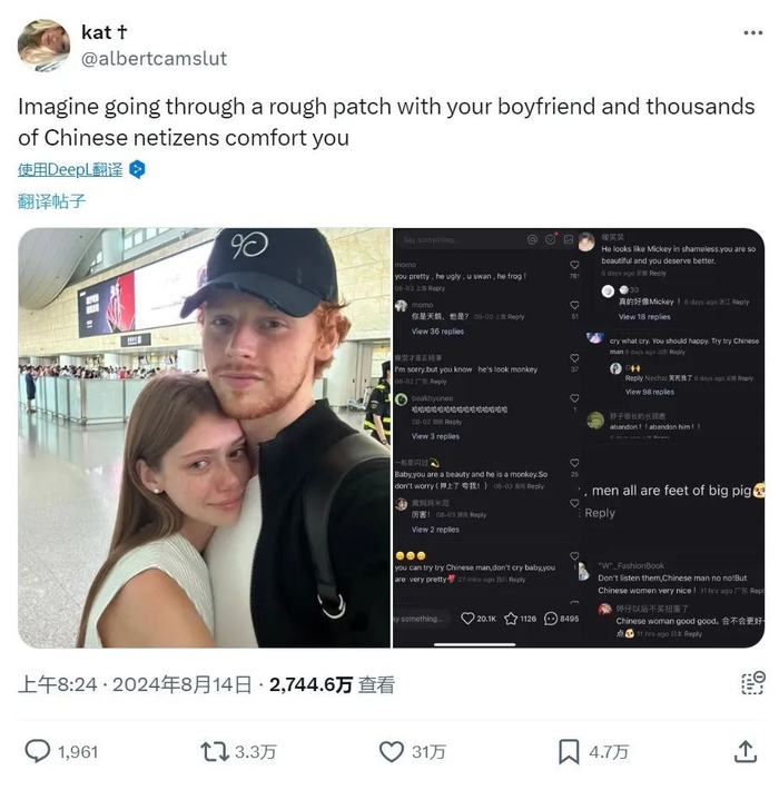(Kris把中国网友的留言截图发到了X上)结果没想到,这个帖子在外网迅速传开,中国网友美丽的精神状态以及强大的造梗能力,让众多老外为之一颤: