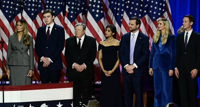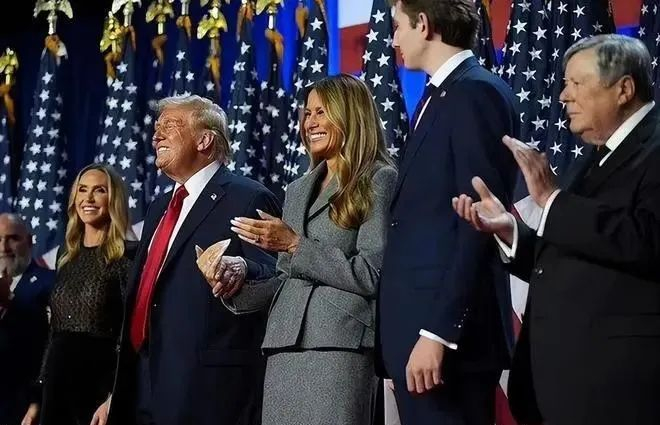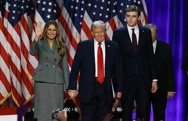 在佛罗里达州棕榈滩会议中心举行的选举之夜活动中,妻子梅拉尼娅和18岁的小儿子巴伦一同登台,站在了最中心的位置。