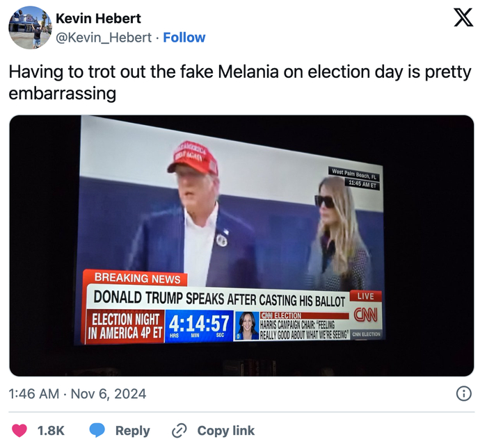 网友甚至怀疑,11月5日现身在佛罗里达州棕榈滩的莫顿和芭芭拉·曼德尔娱乐中心的是假梅拉尼娅。