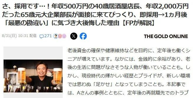 (截图来自日本网友评论)“像这样可悲的人还有很多。他们无法理解,自己的地位完全是因为公司的支持才得以维持。他们以为自己还是以前工作时的地位,误解了自身的价值。退休后,他们就只是个普通人了。”