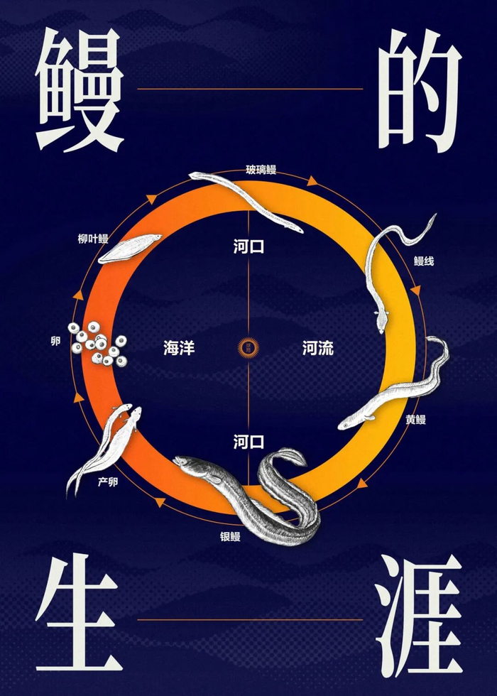 洄游,是鱼类独有的一种周期性迁徙活动。翻译成大白话就是:鳗鱼有时候住在江里,有时候住在海里。黄鳗会在从江里游到海里的过程中变成银鳗,然后在深海里产卵、繁育后代。