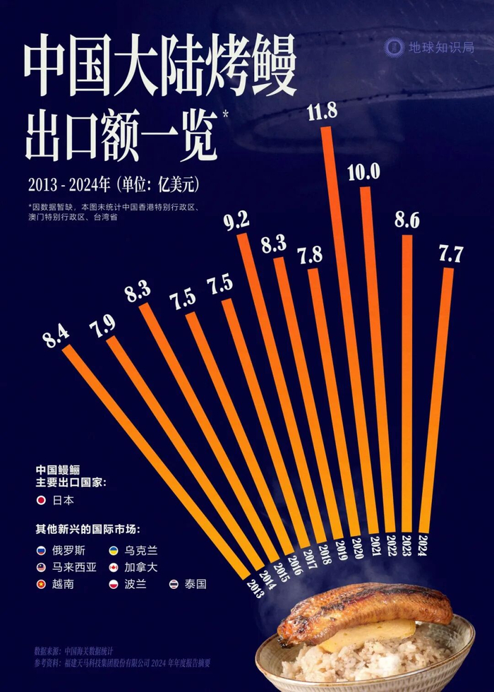 中国是世界鳗鱼养殖和出口第一大国,2022年出口了6.4万吨。不仅能满足整个日本市场的需求,还能向别的国家出口。