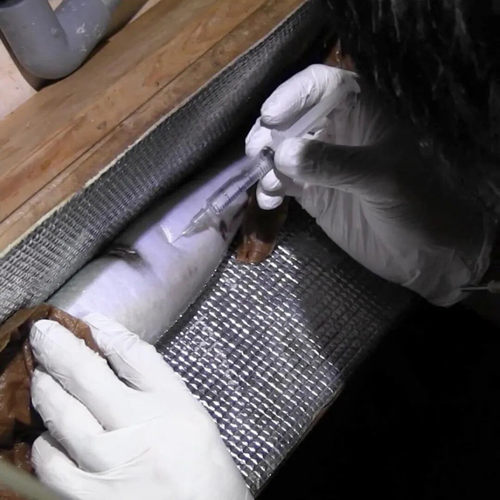 首先是要给鳗鱼注射其他鱼类的脑垂体提取物和促性腺激素,让鳗鱼性成熟。在这个过程中还要在培育池里制造一个水流、水温都可控,且鳗鱼数量不密集的环境,不断调整环境参数,让鳗鱼自然性成熟。