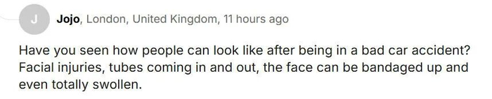 “你见过人遭车祸重伤后的样子吗?面部受伤,身上插满各种管子,脸上缠着纱布,甚至整个脸都肿起来。”