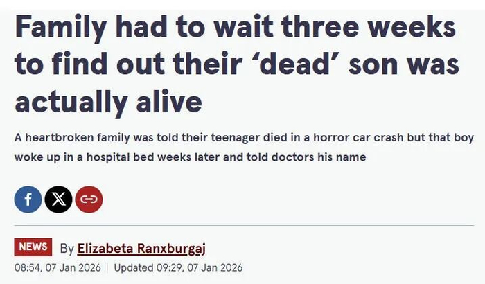 据媒体报道,这是因为约书亚和特雷弗的长相、身材都有些像,又年龄相仿,对不熟悉他们的人来容易分不清,而且车祸后受伤的特雷弗一直没醒,不能向他核实身份,种种因素加在一起,这才让警方搞混了。