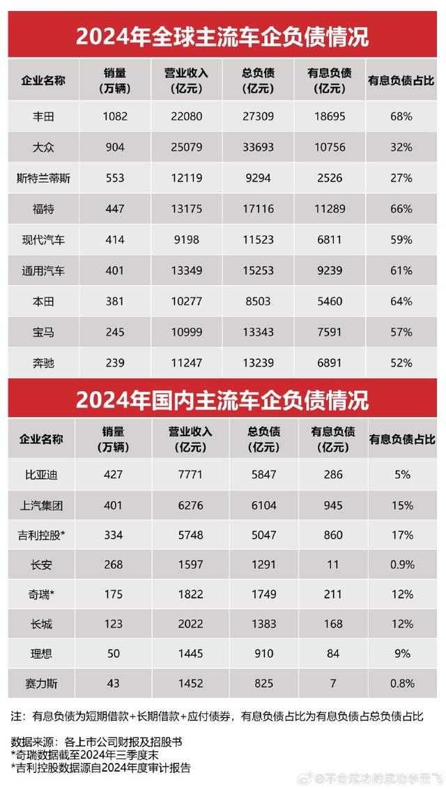 首先,用“恒大”来类比比亚迪,本质上就是偷换概念。 这种类比是偷换概念。 恒大暴雷源于地产金融游戏,而比亚迪的负债是制造业常态(5847亿总负债对比丰田2.7万亿、大众3.4万亿等)。关键看债务结构: 比亚迪有息负债仅286亿(占5%),远低于同行,手握1549亿现金,资金链稳健,与恒大流动性枯竭天差地别。